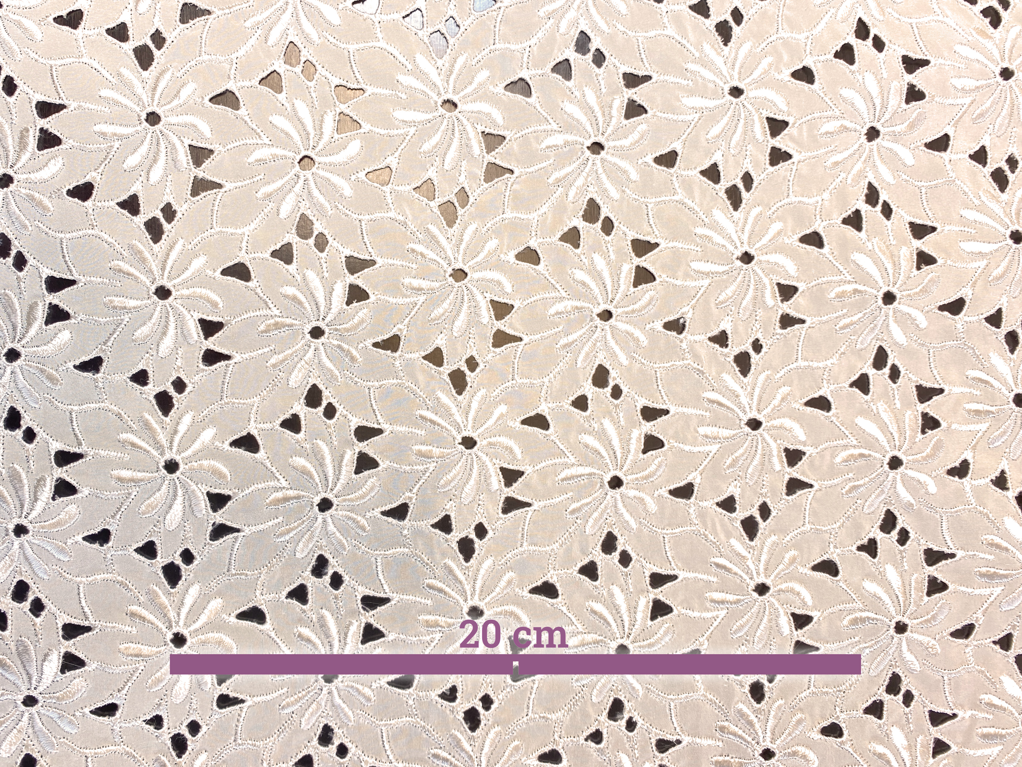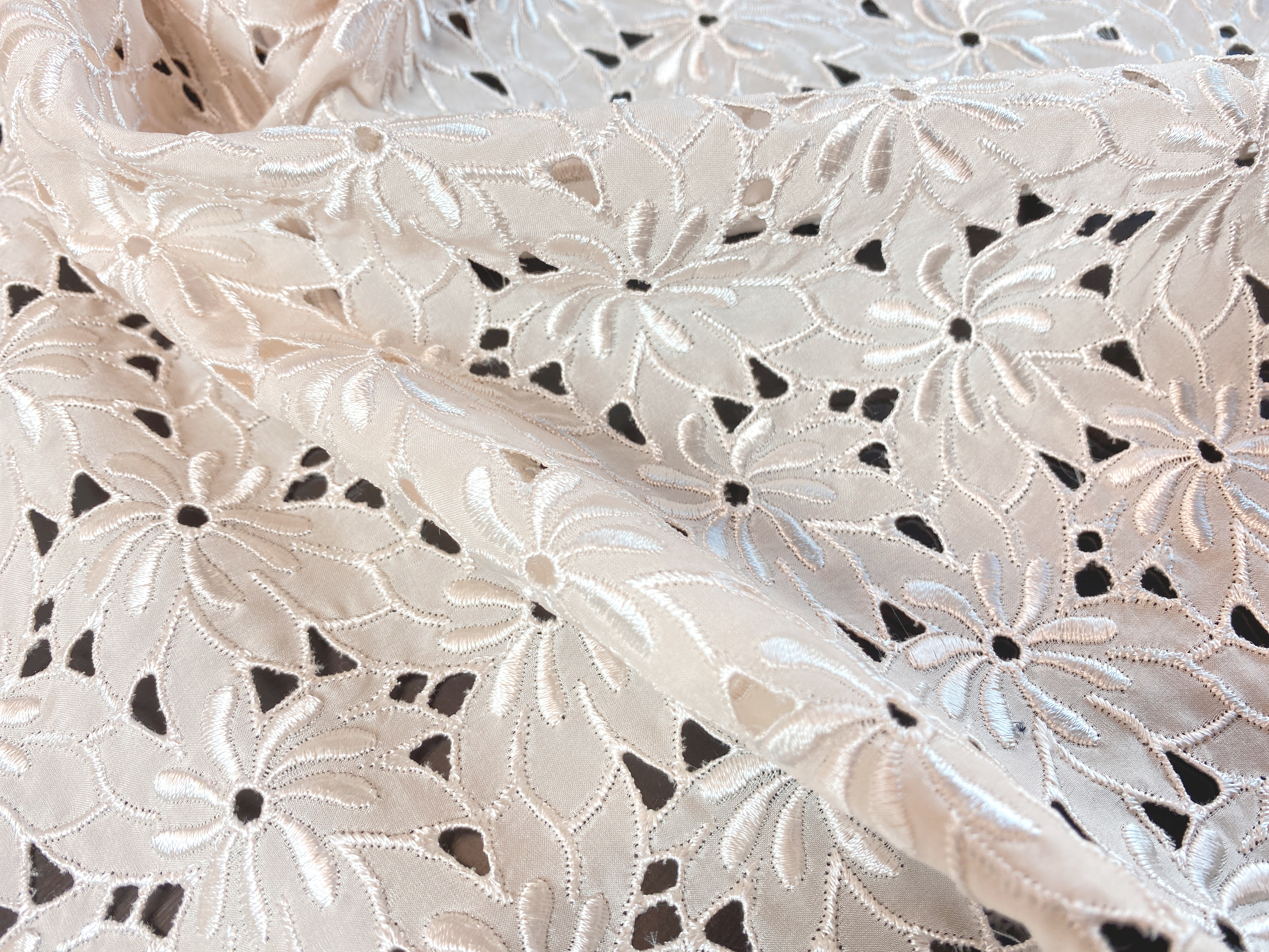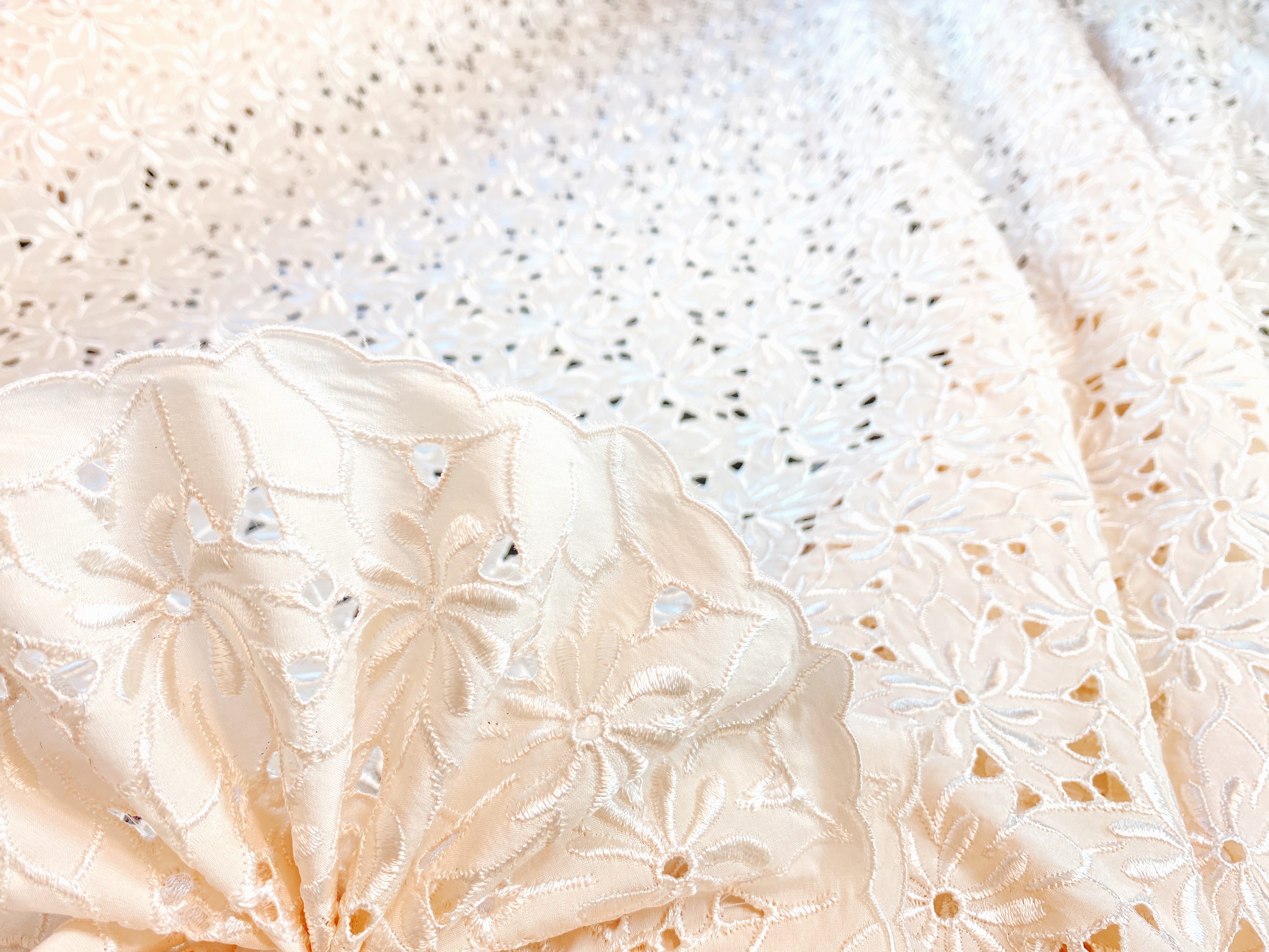 100% Seide, Madreirastickerei auf Crepe de Chine, beidseitige Bogenkanten, Farbe elfenbein, zart cremefarben, Breite 112 cm, geeignet für sommerliche Kleider, Röcke, Oberteile, Brautmoden