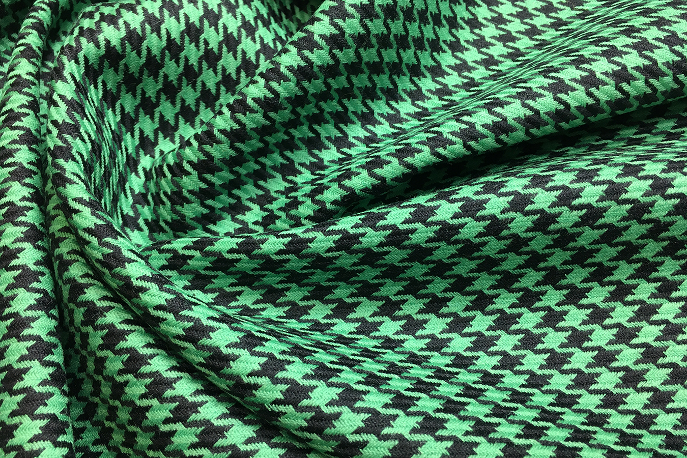 100% Schurwolle, gewebtes Hahnentrittmuster in smaragdgrün-schwarz, Breite 150 cm, geeignet für Kostüme, Hosenanzüge, Röcke, Jacken, Übergangsmäntel