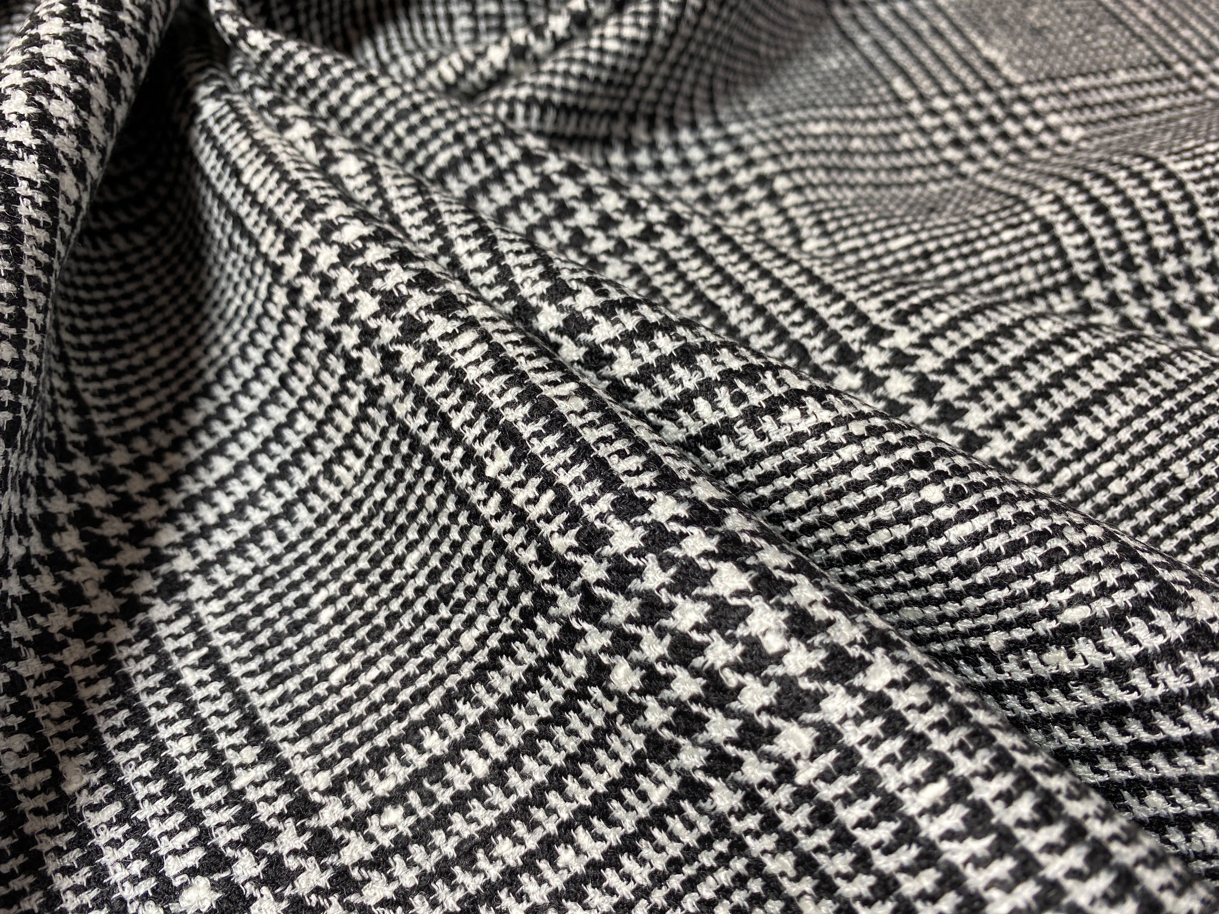 70% Schurwolle 20% Leinen 10% Seide (Bouretteseide) weichfallende Kleiderware in Glencheckwebung in schwarz-weiß, Breite 152 cm, geeignet für Kleider, Röcke, Kostüme, Oberteile, Übergangsmäntel