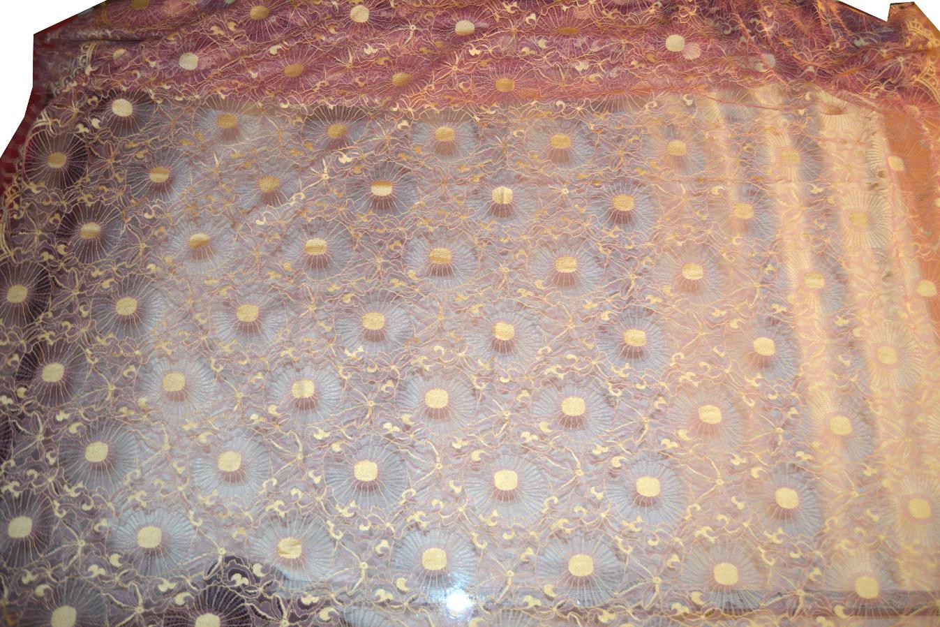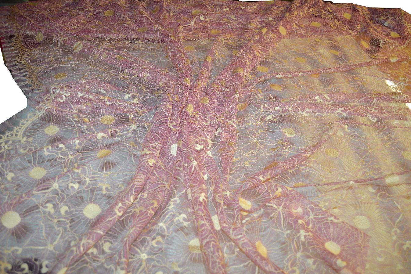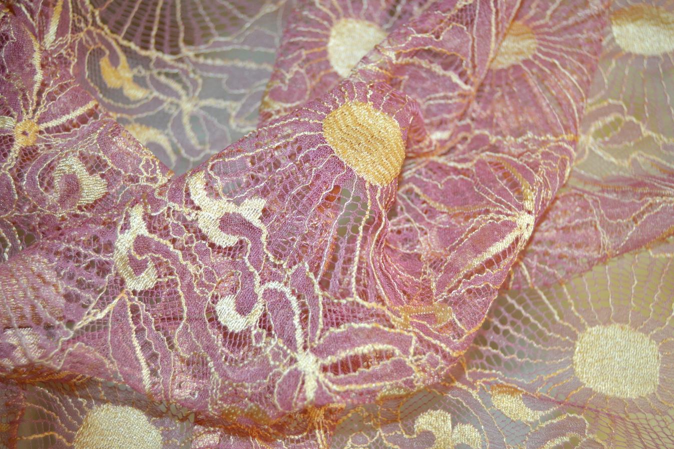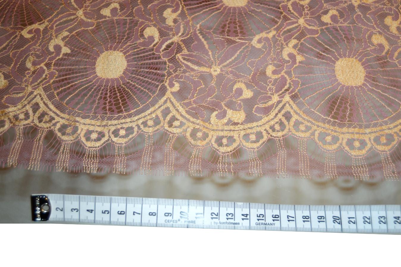 Viskose / Polyamid, Spitze, beidseitige Bogenkante, Farbe rosa mit goldgelb, Breite 140 cm